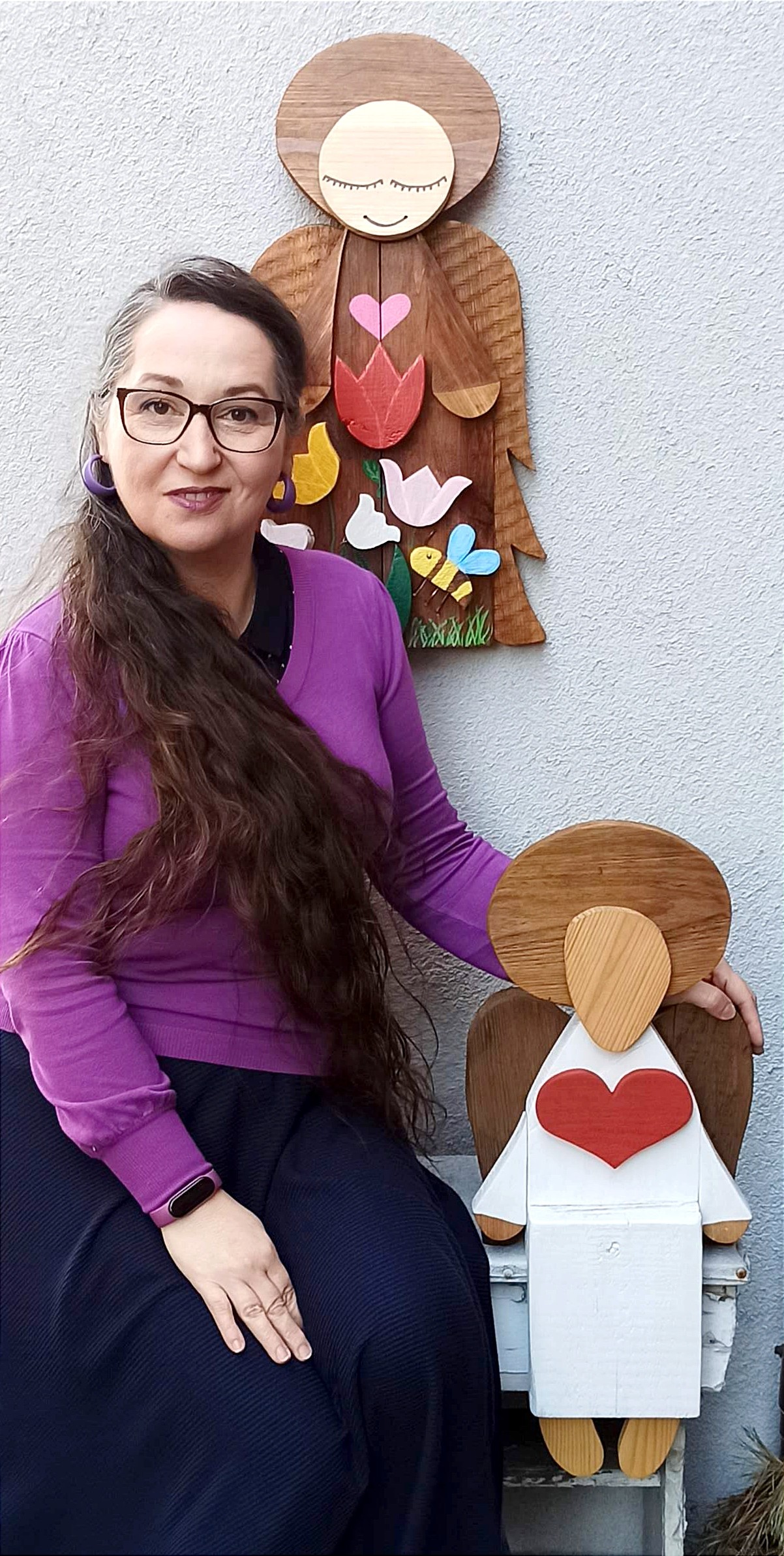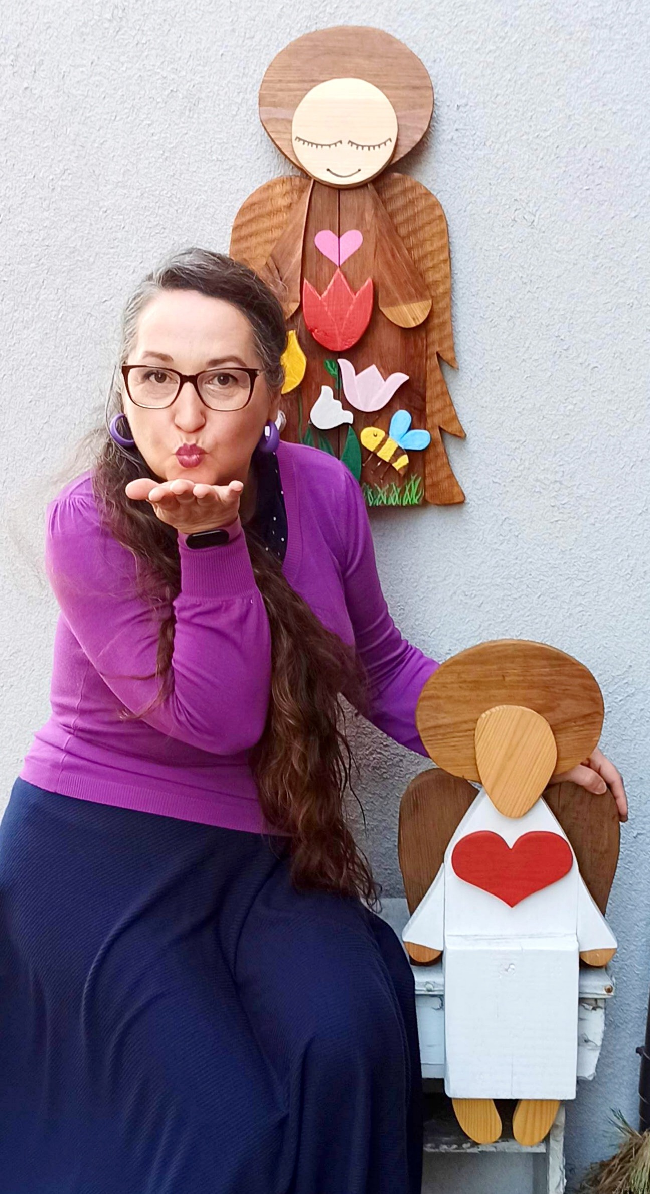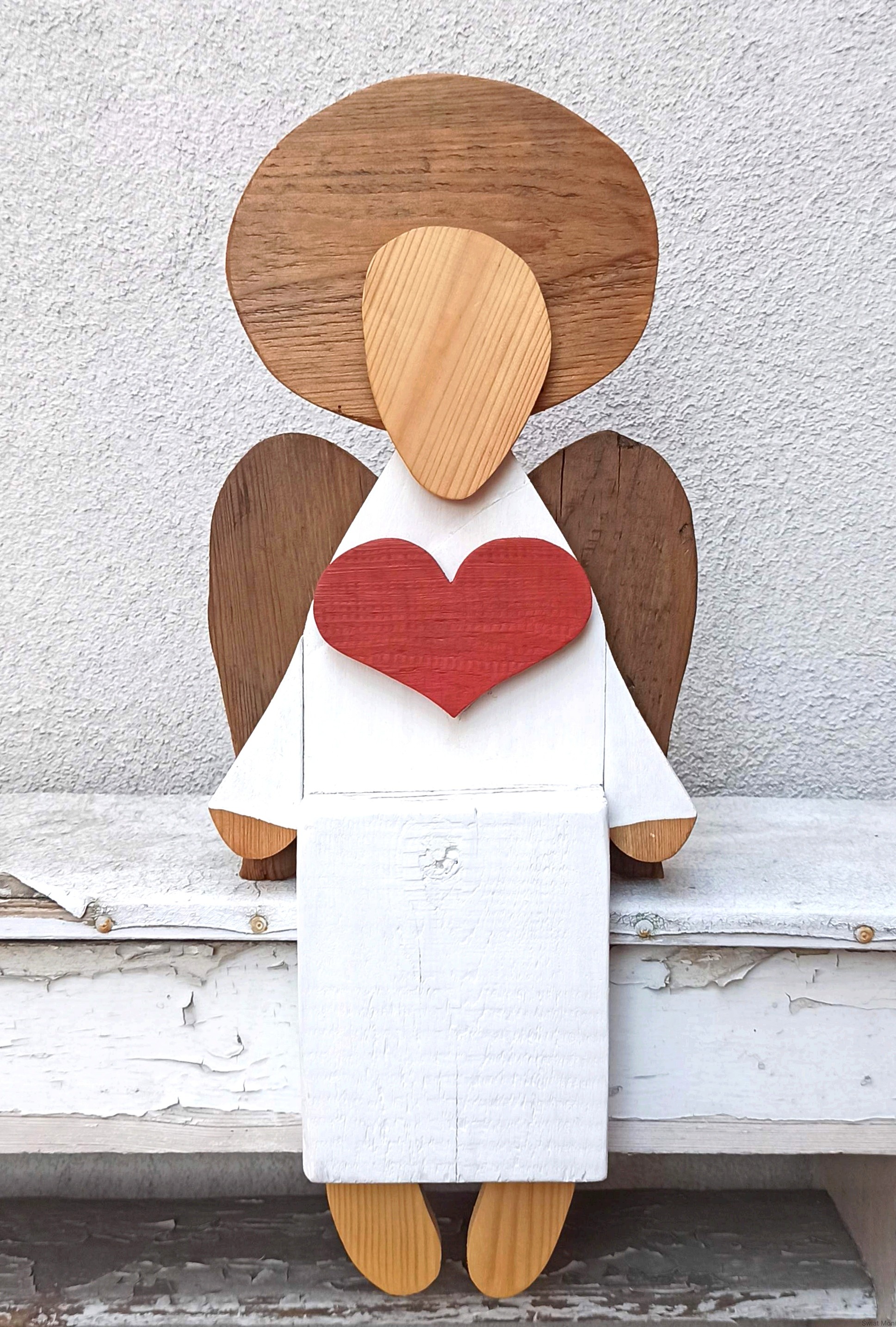 Anioł siedzący w białej sukni z czerwonym sercem 64 cm