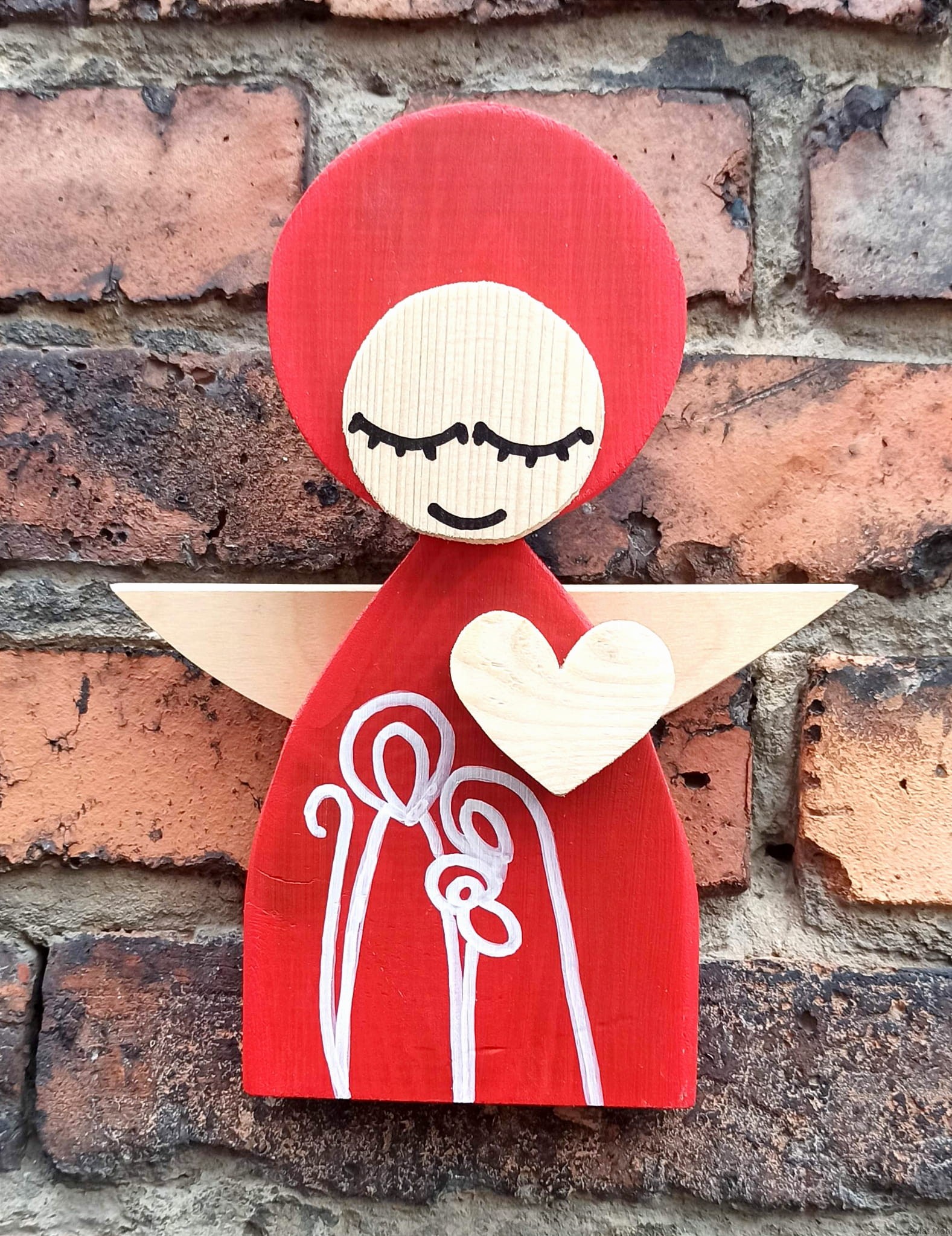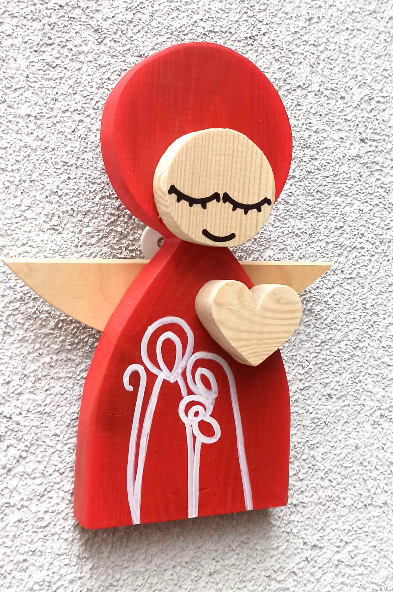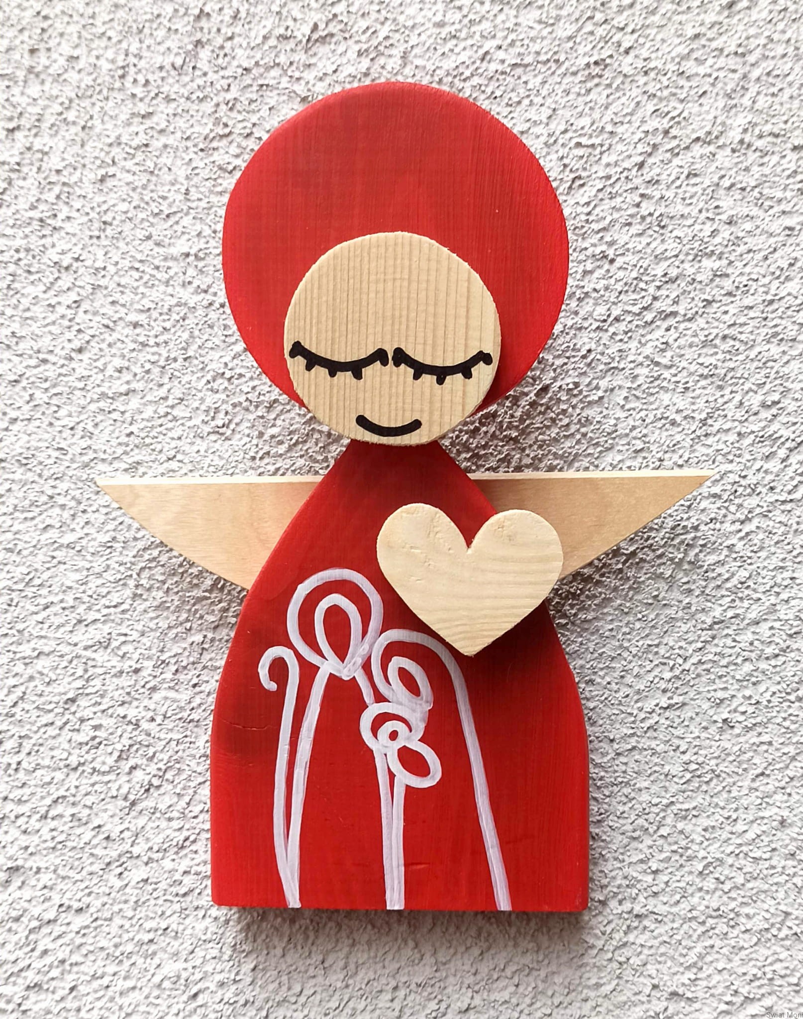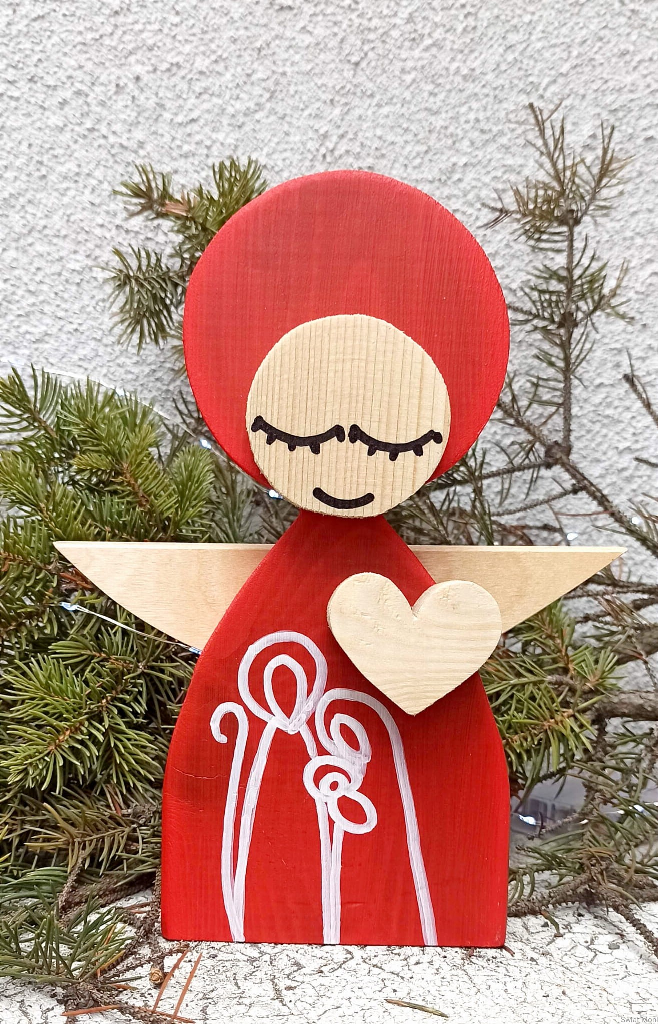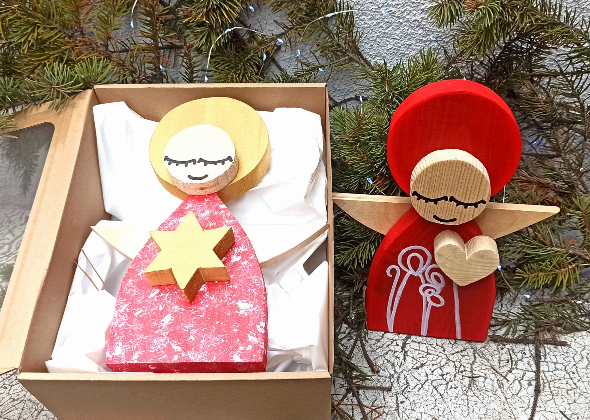 Aniołek Świąteczny ze Świętą Rodziną 24 cm czerwony w pudełku z okienkiem