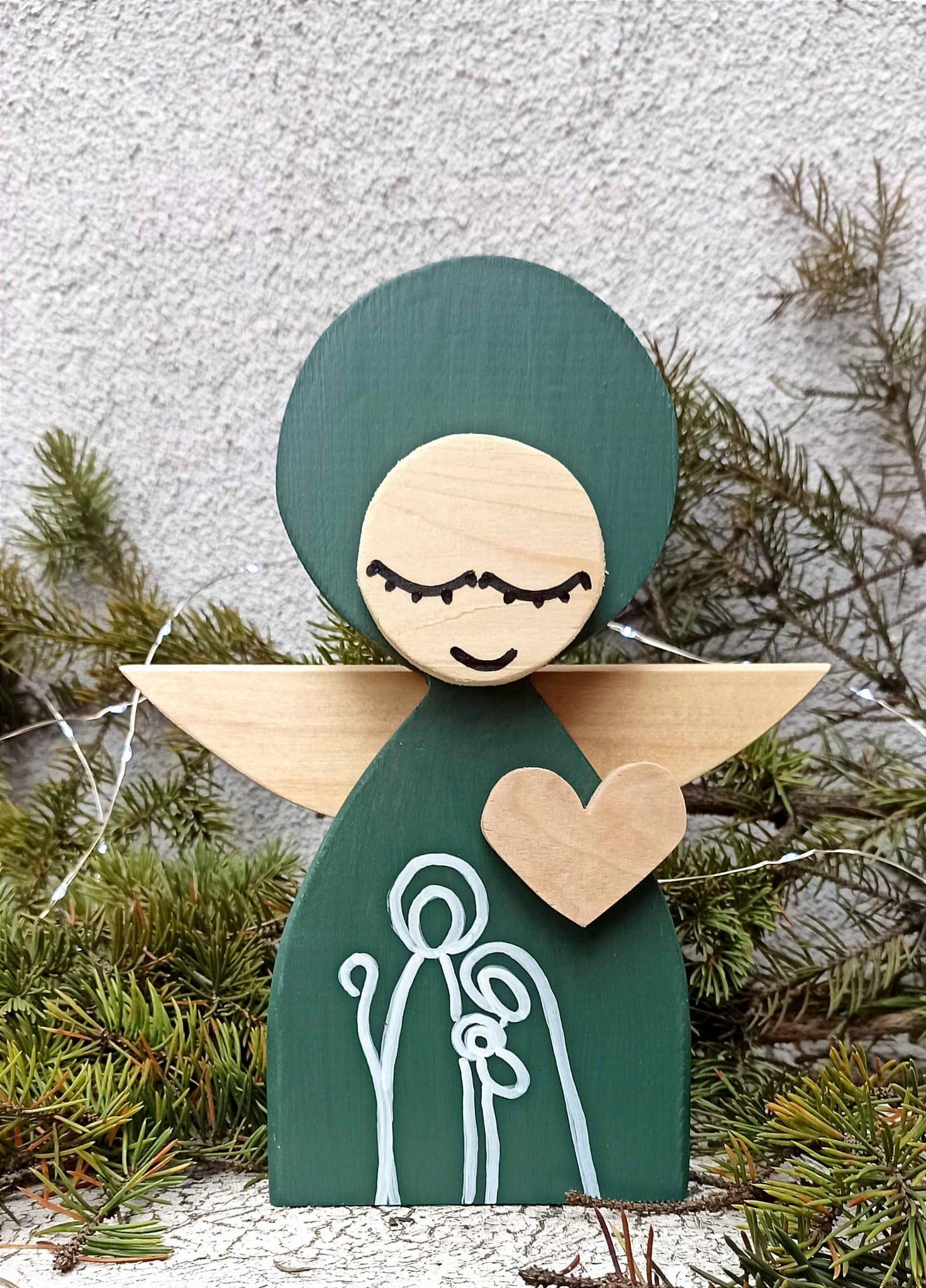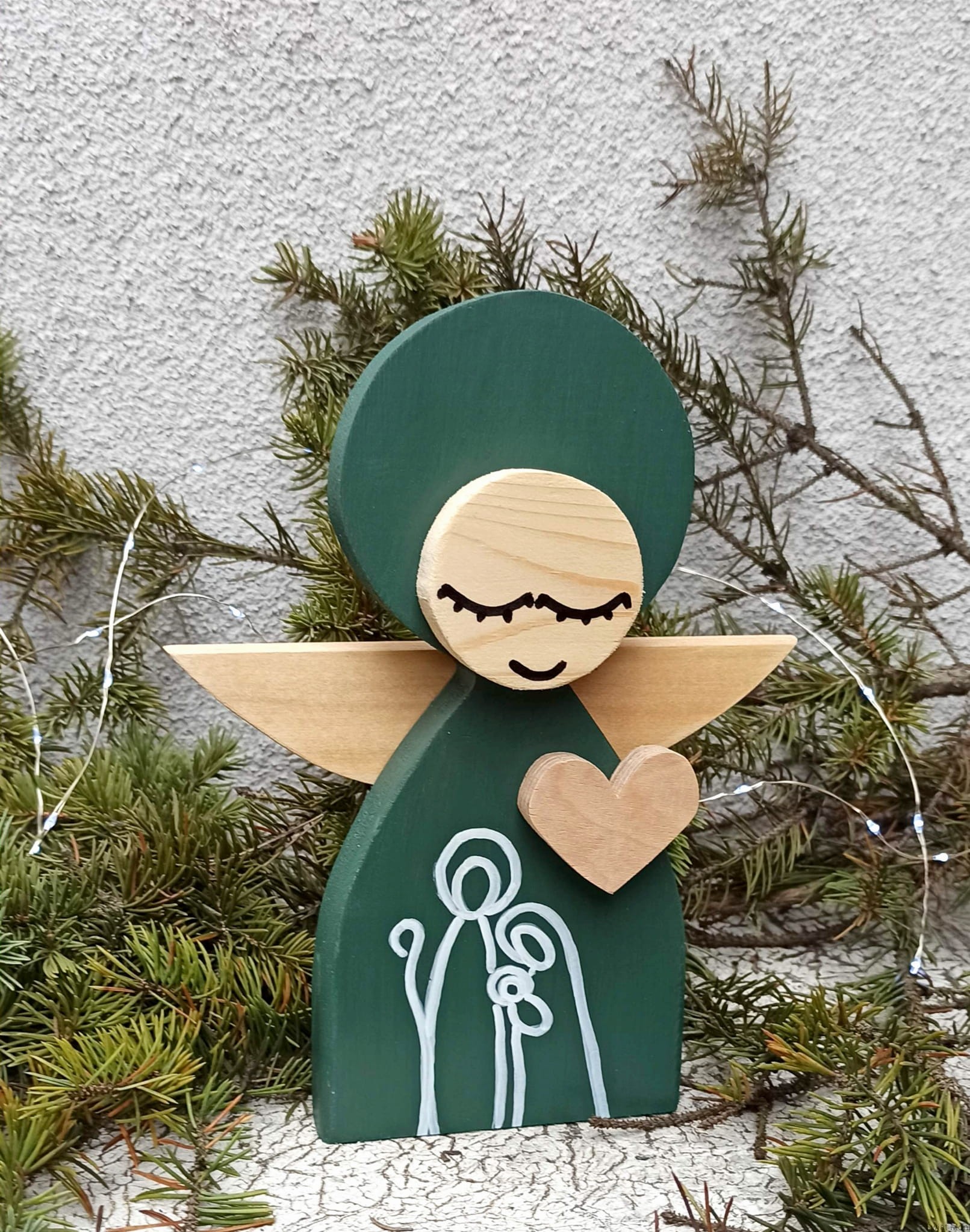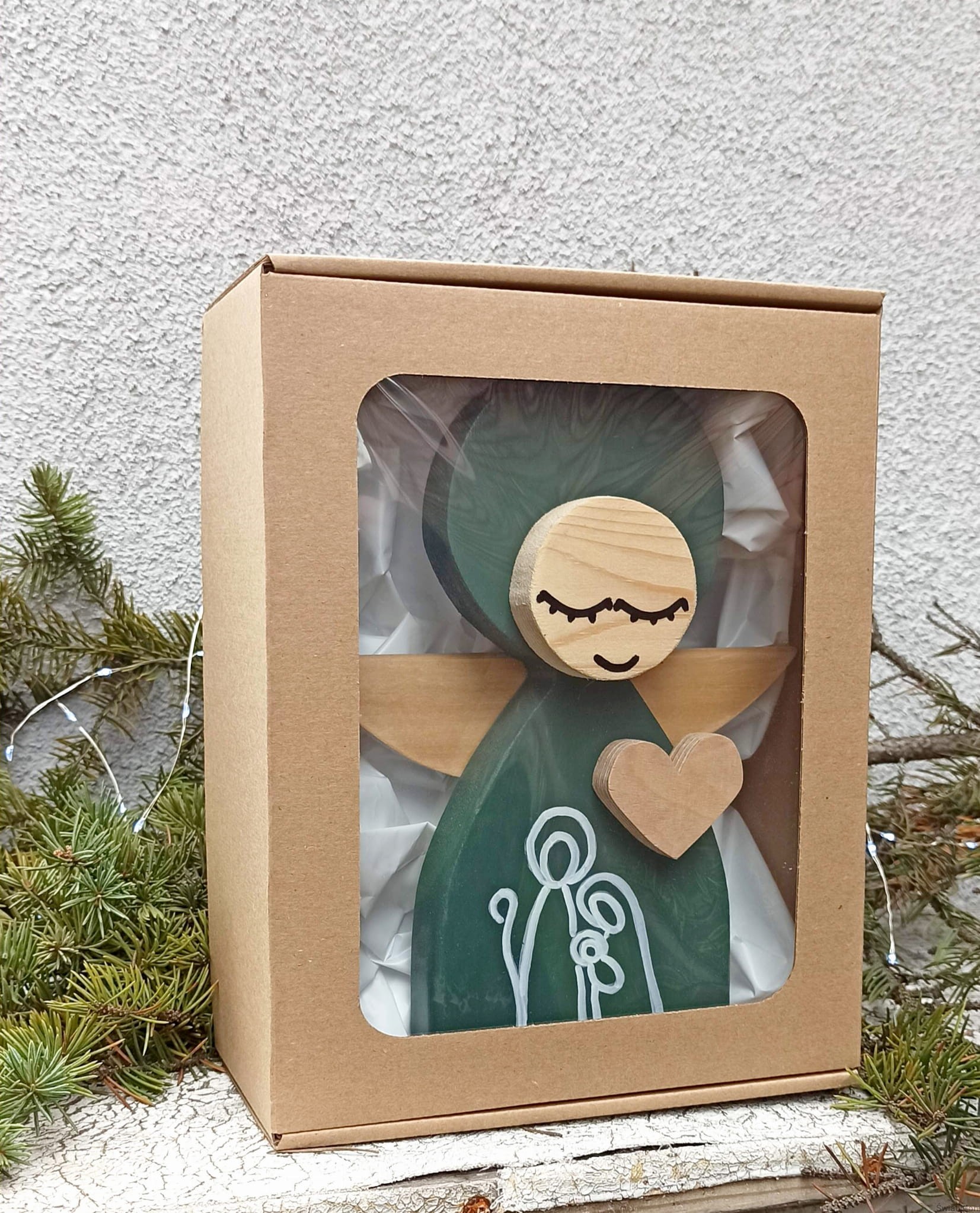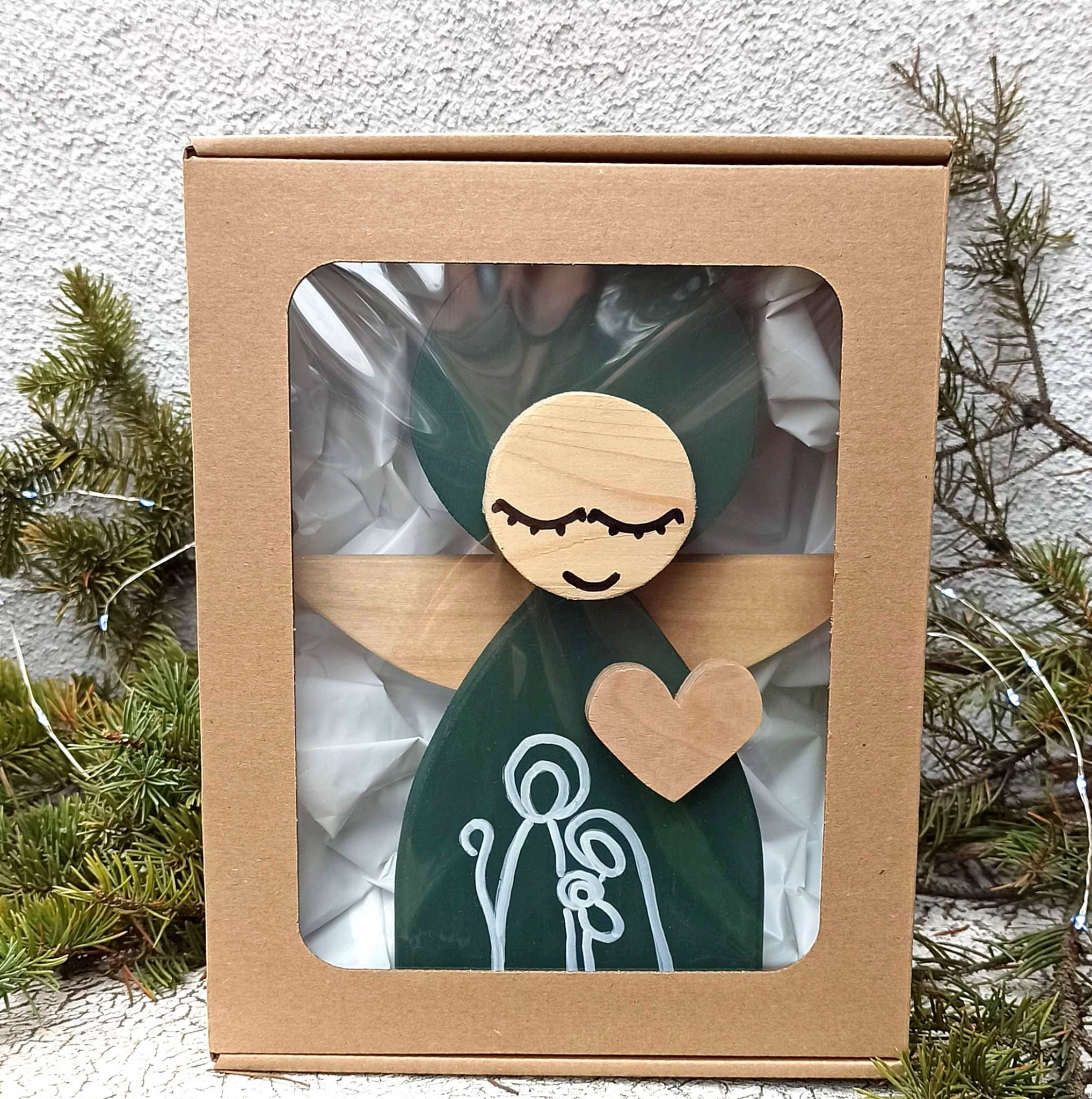 Aniołek Świąteczny ze Świętą Rodziną 24 cm w zielonej sukni w pudełku z okienkiem