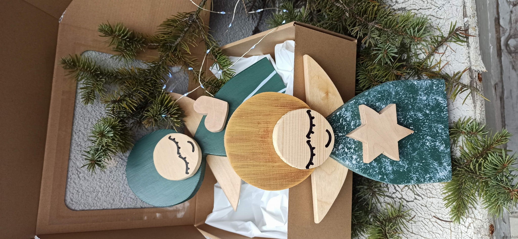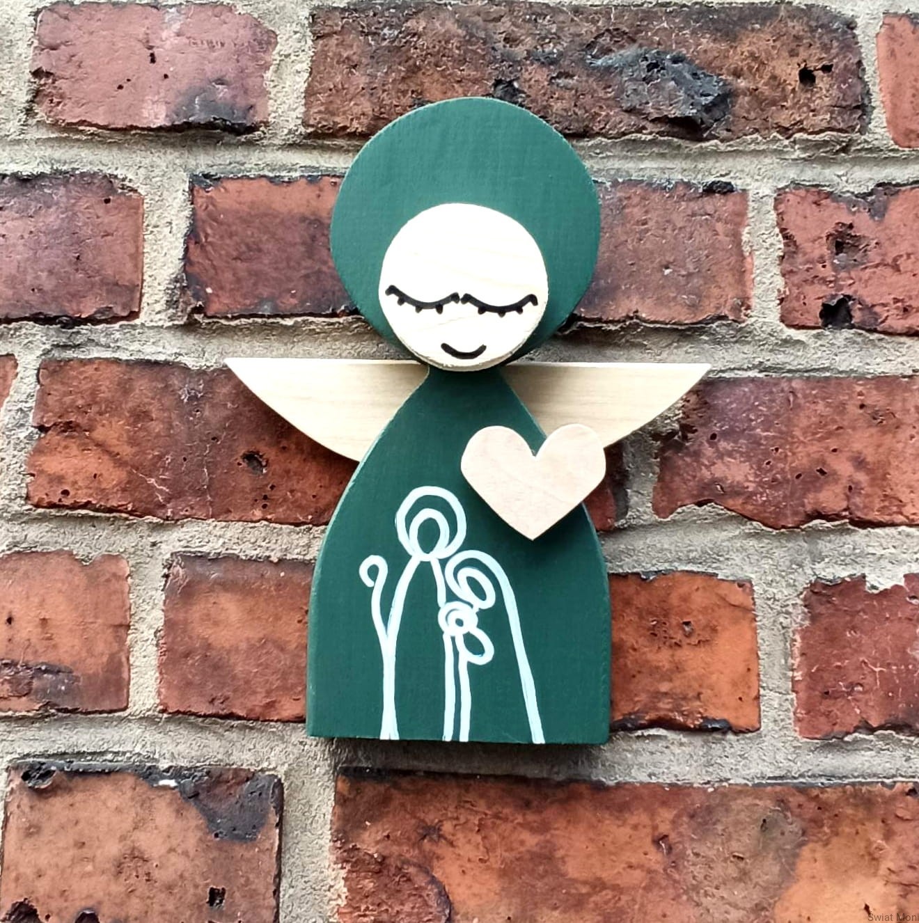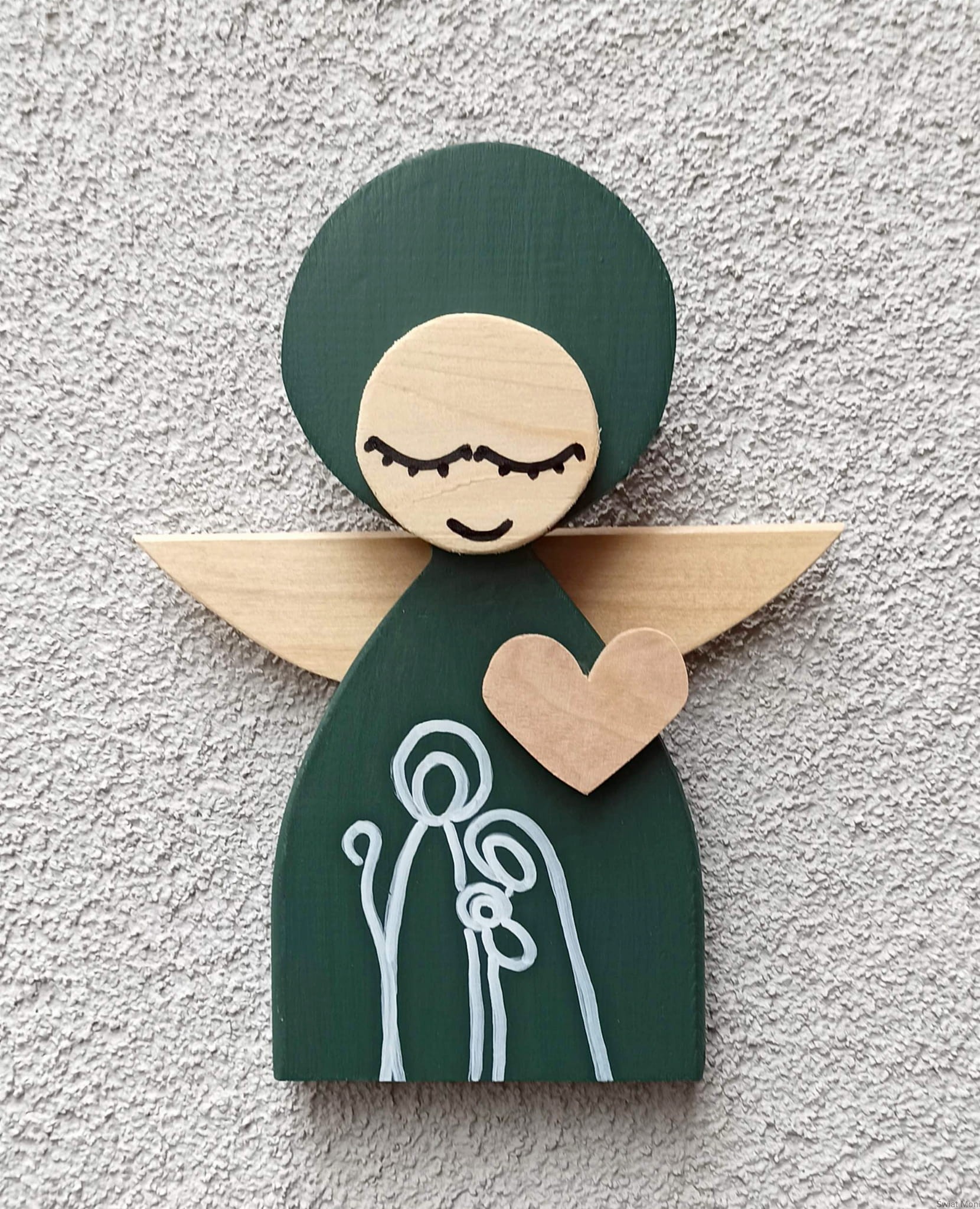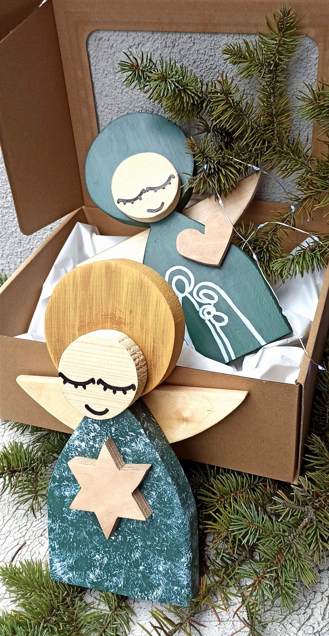 Aniołek Świąteczny ze Świętą Rodziną 24 cm w zielonej sukni w pudełku z okienkiem