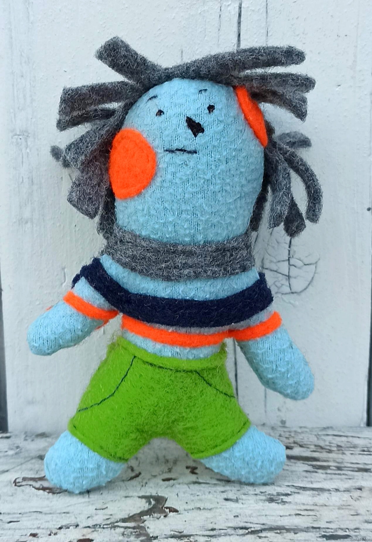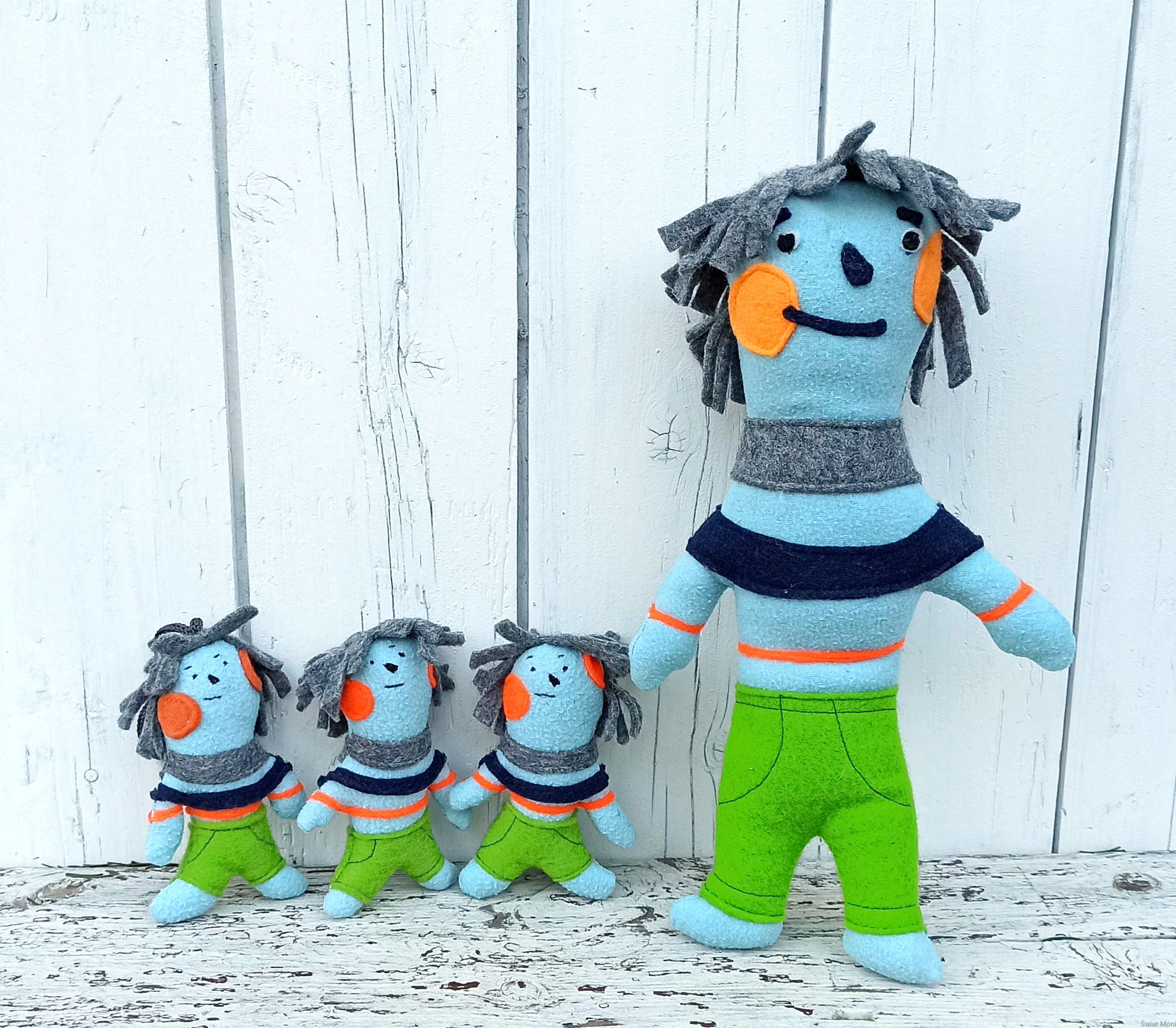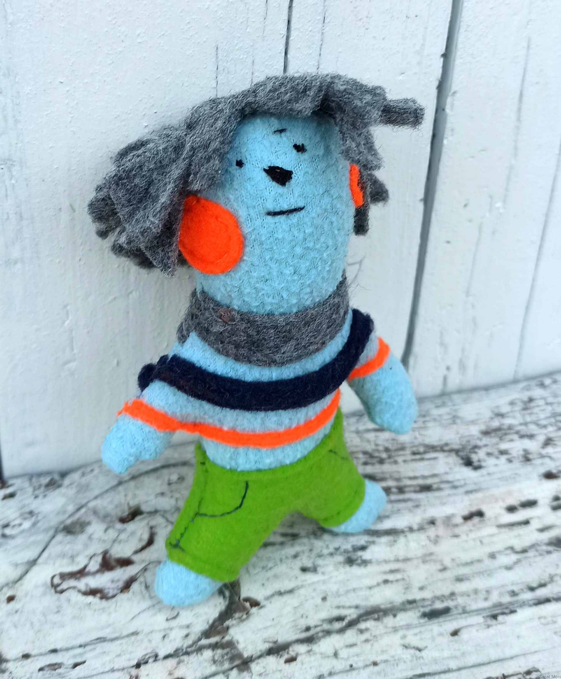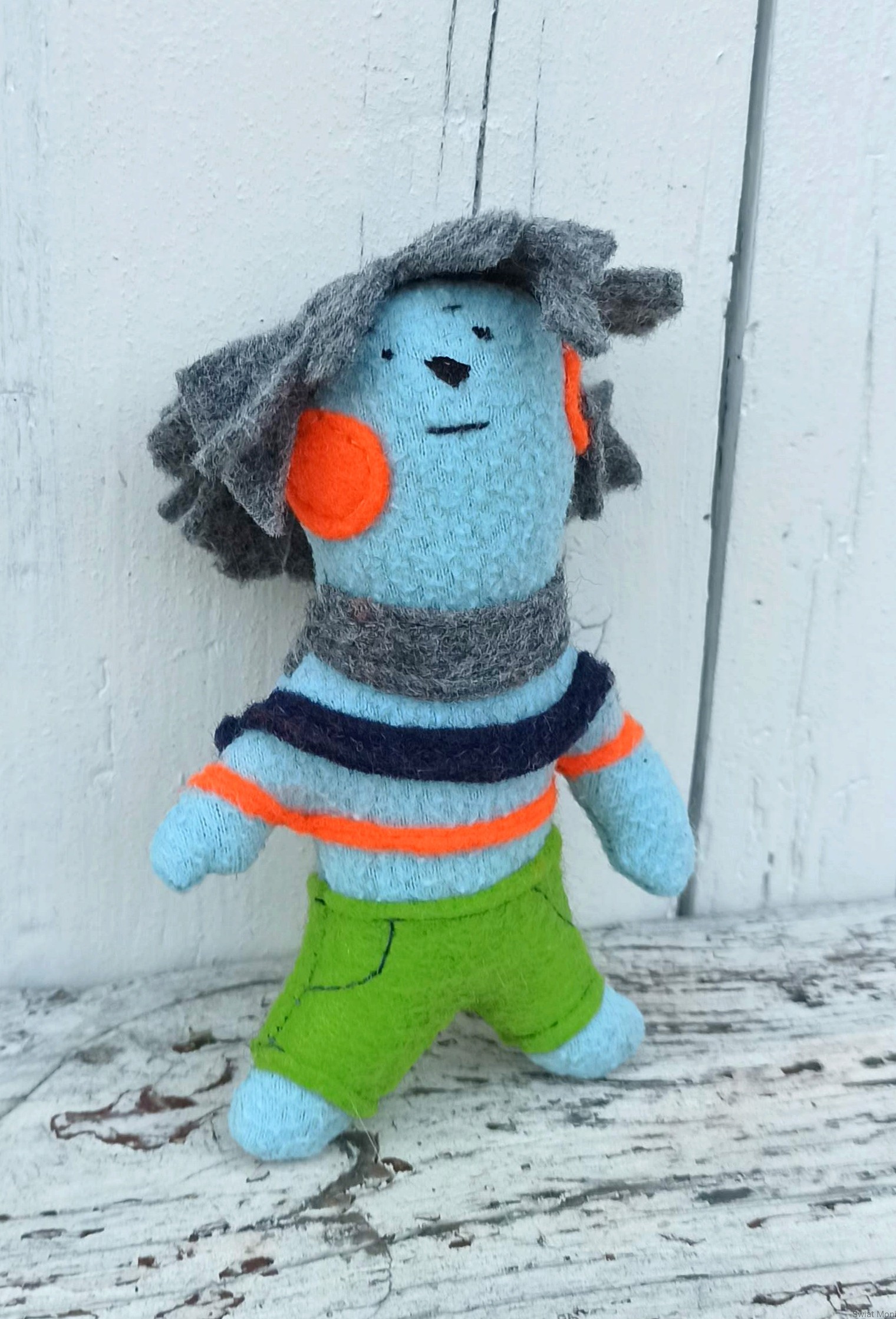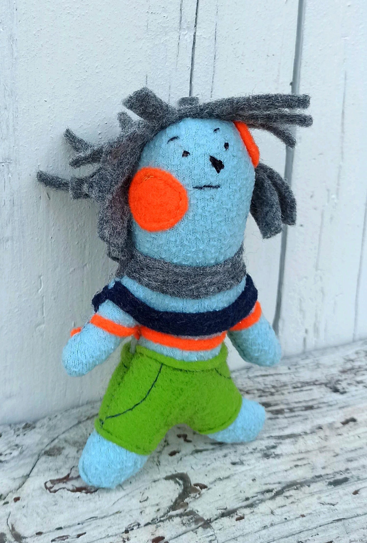 Lalka Noni o wzroście 12 cm, uszyta z dzianiny i filcu, wkład antyalergiczny. Laleczki szyte maszynowo, ale wykańczane ręcznie, więc mogą różnić się delikatnie o tej ze zdjęcia.