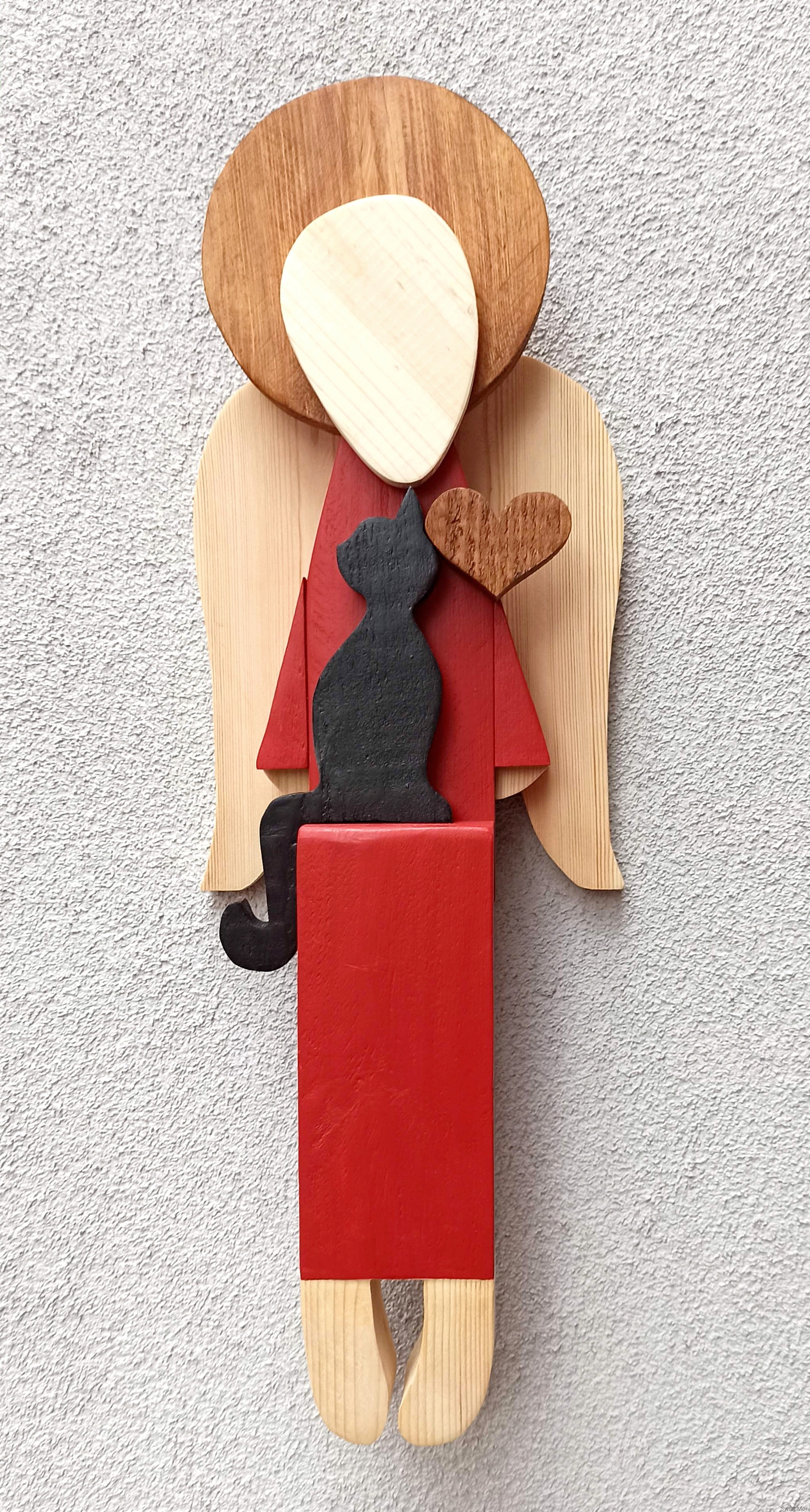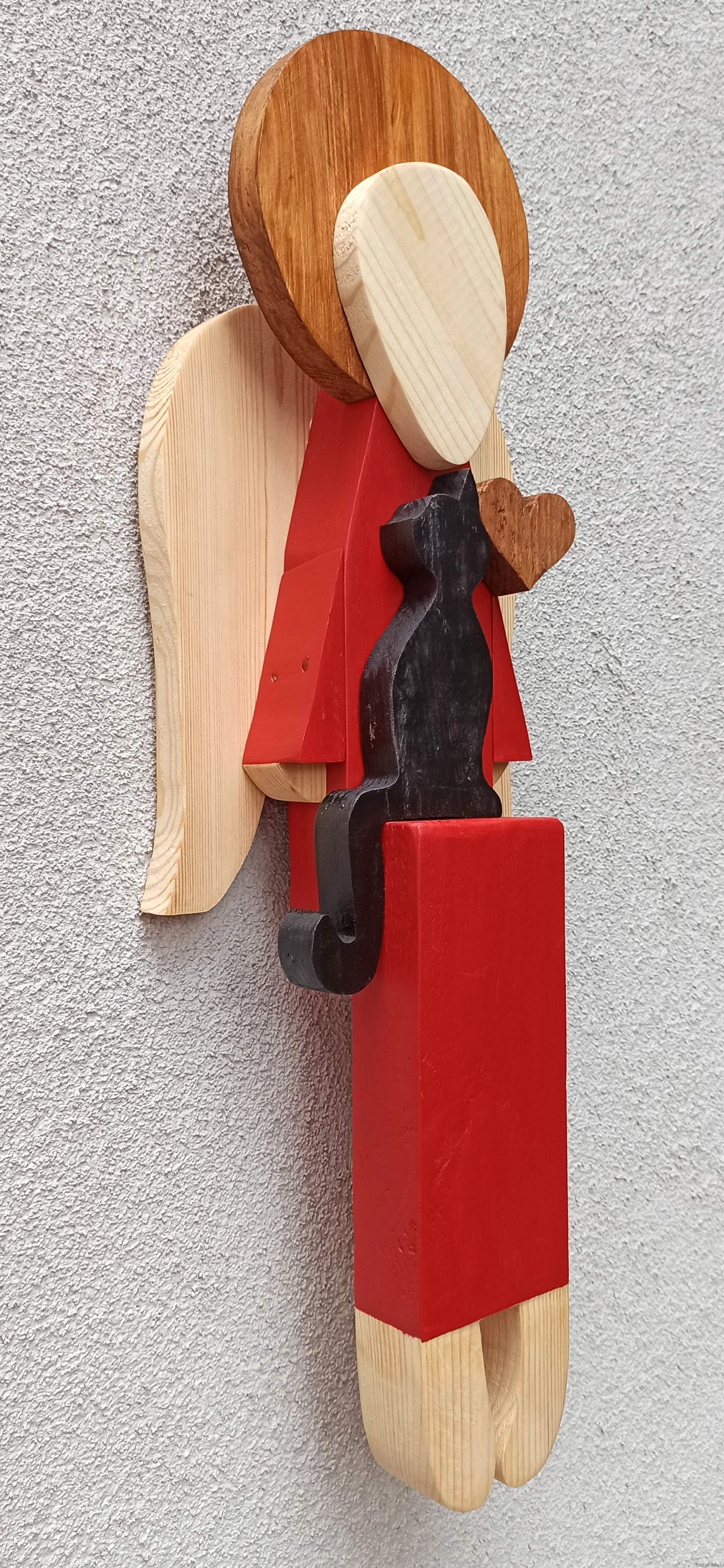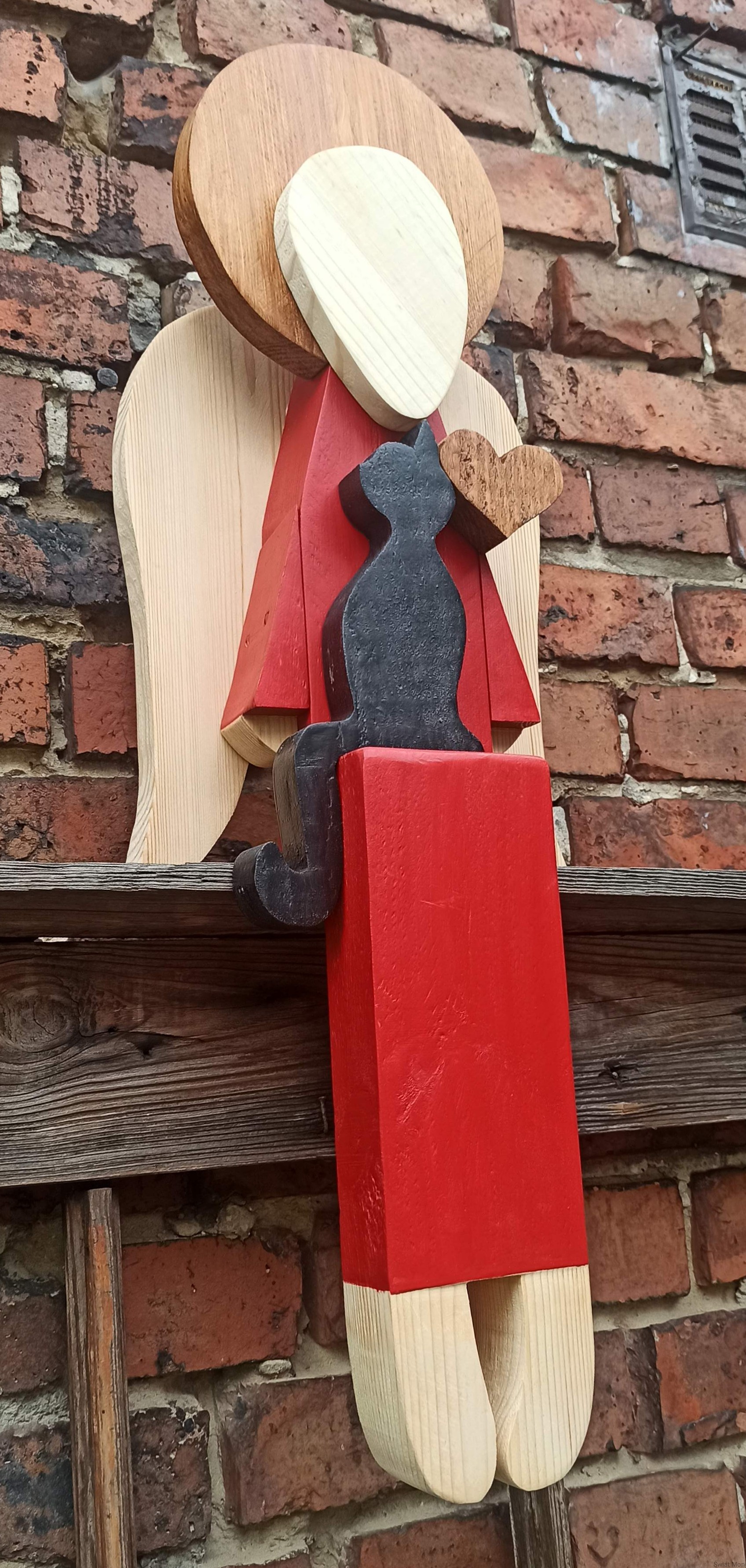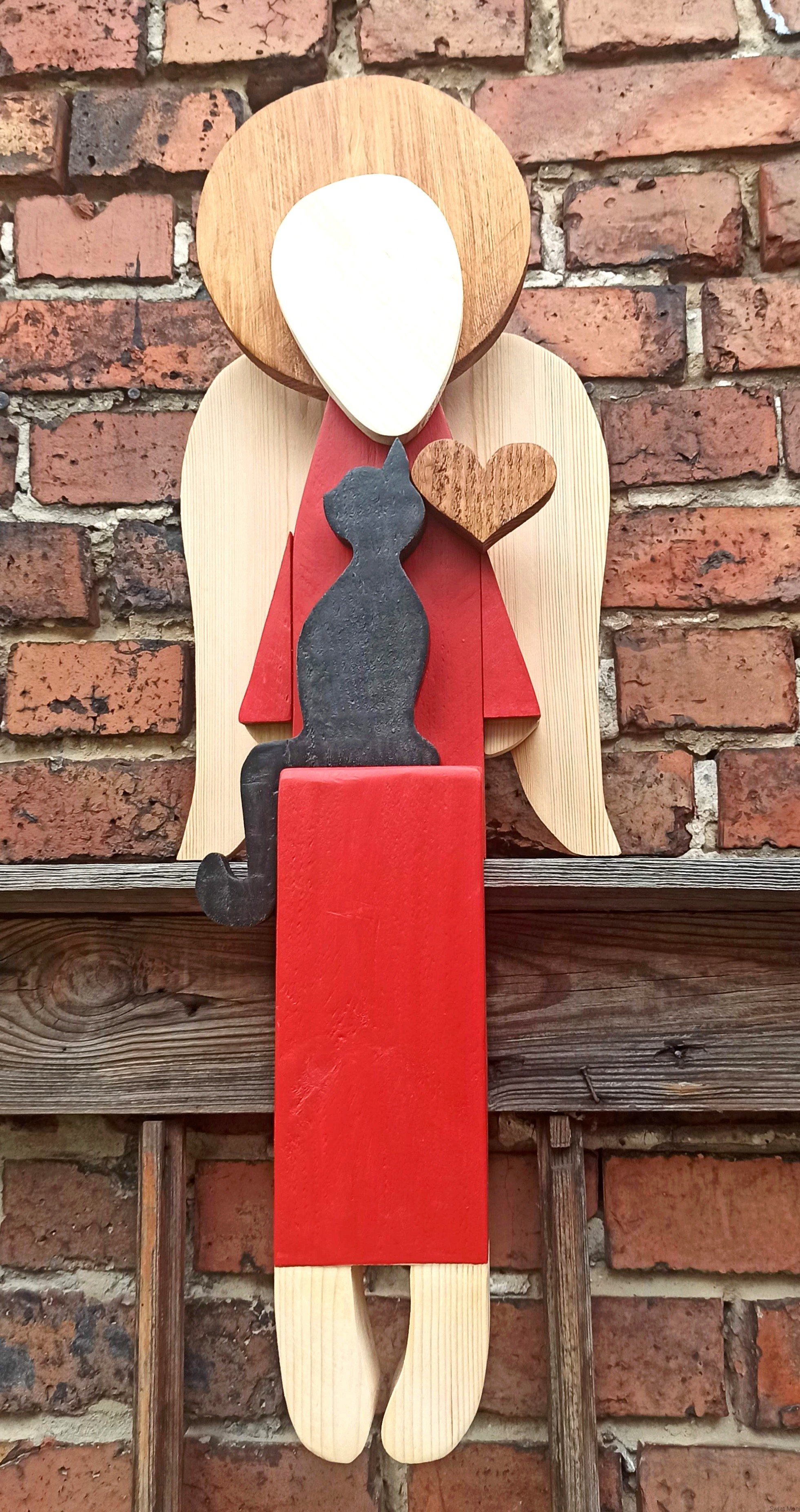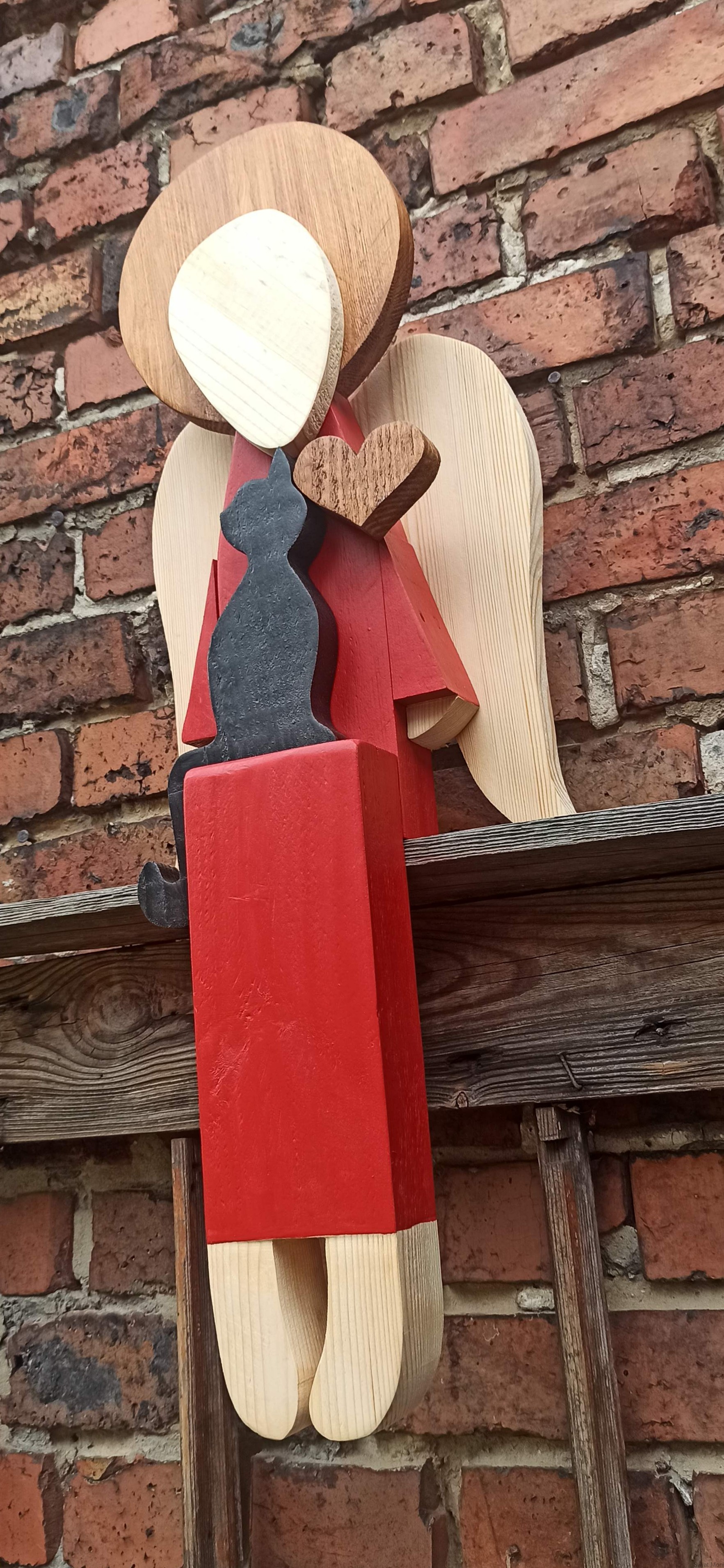 REZERWACJA !!! Anioł siedzący w czerwonej sukni z czarnym kotem 70 cm
