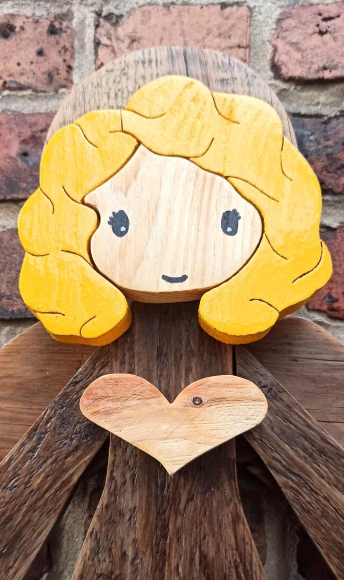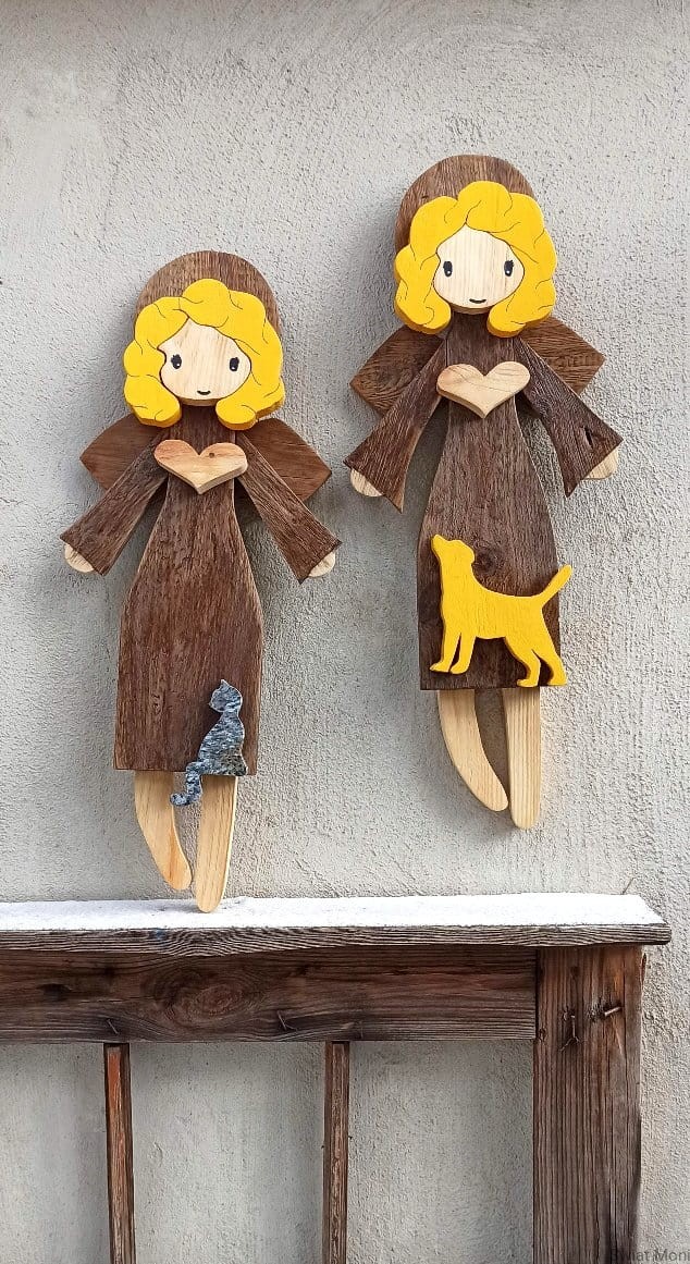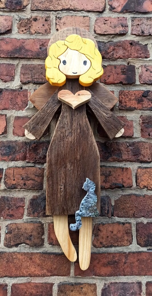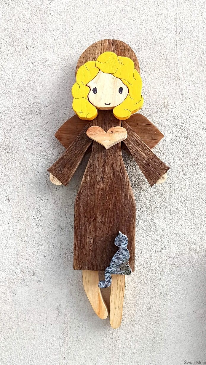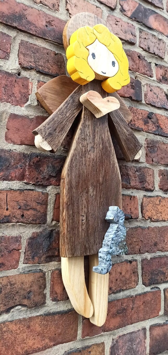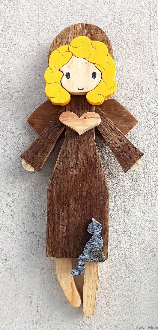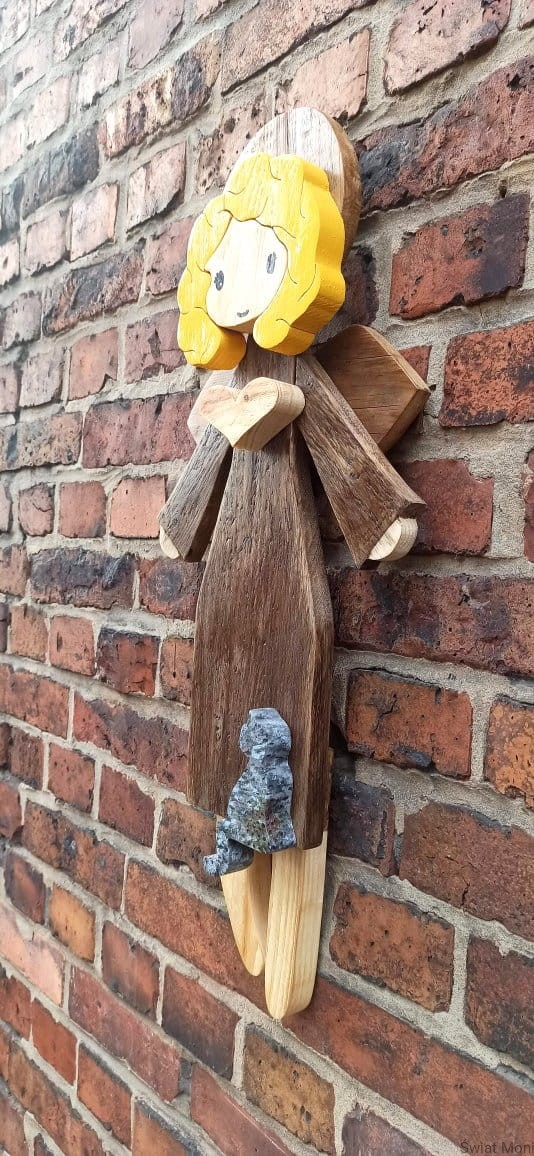 Wyjątkowy Anioł w blond lokach z szarym kotem. Wykonany ze starej i nowej deski. Wysokość ok 70 cm. Całość zaimpregnowana, Anioł może wisieć na zewnątrz lub wewnątrz. Na zamówienie dowolna kolorystyka oraz zwierzątko. Napisz wiadomość a razem ustalimy szczegóły.