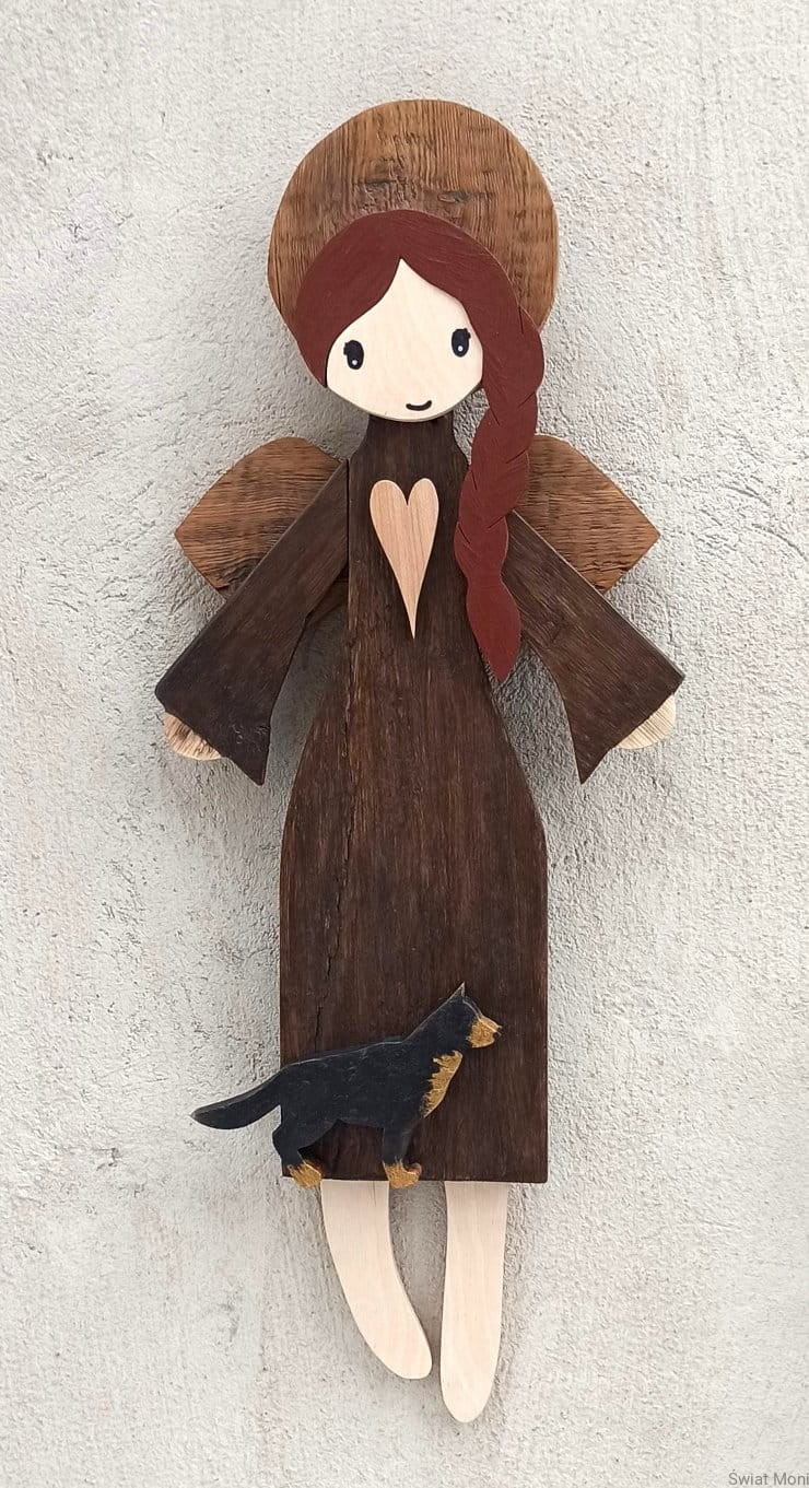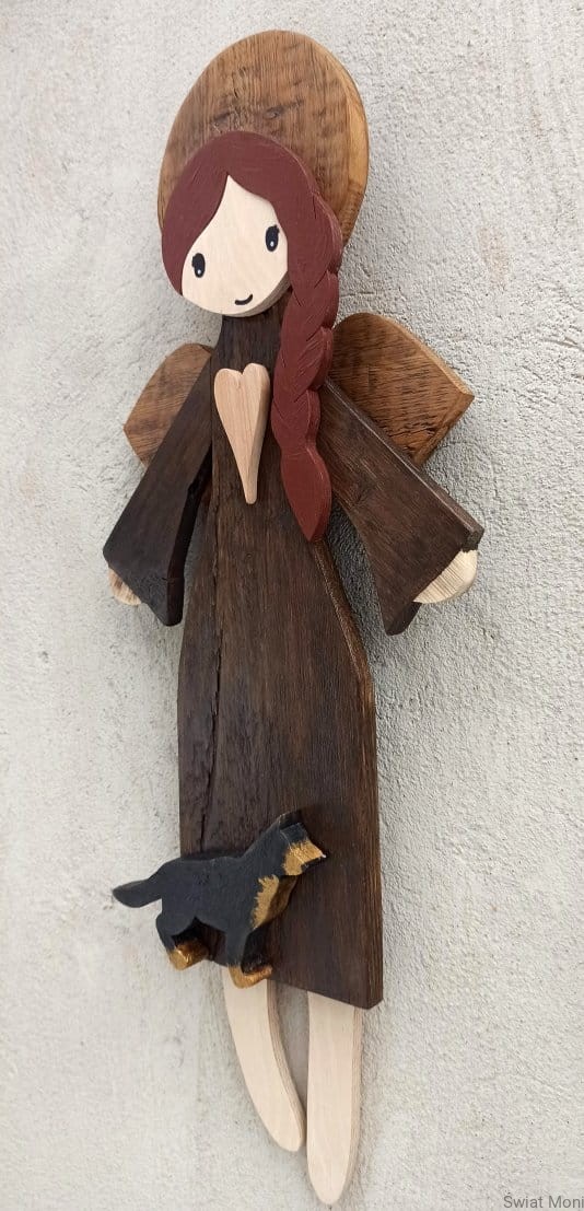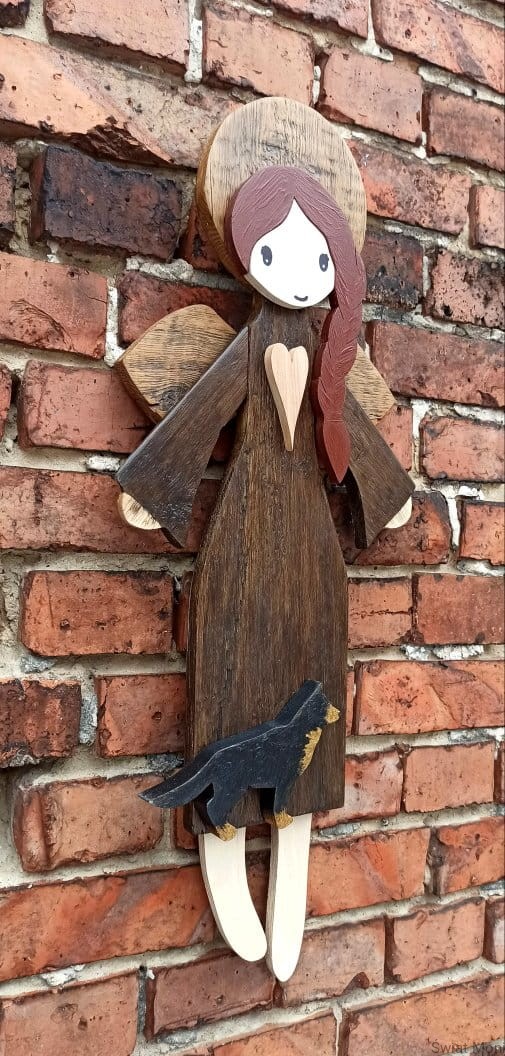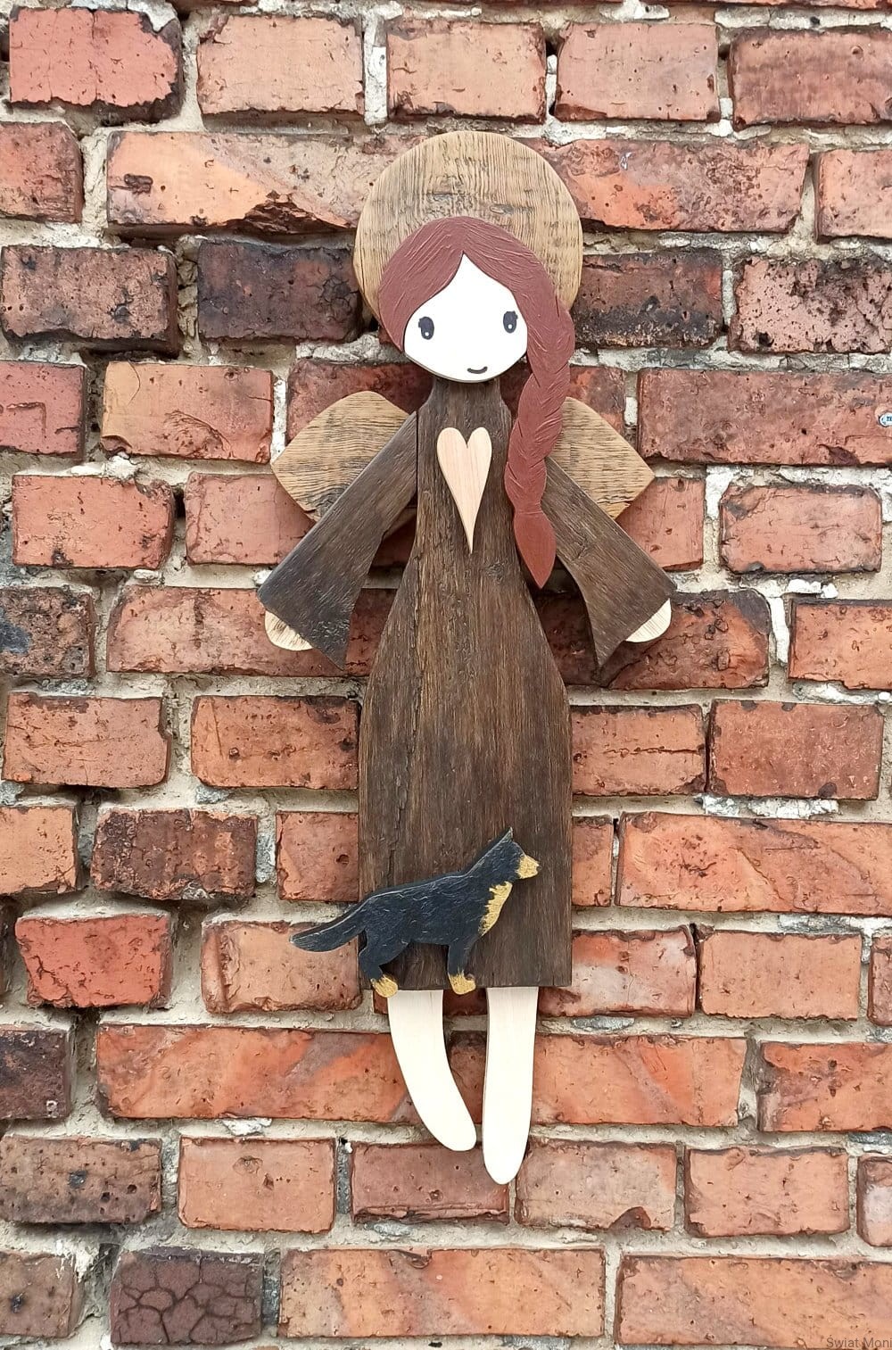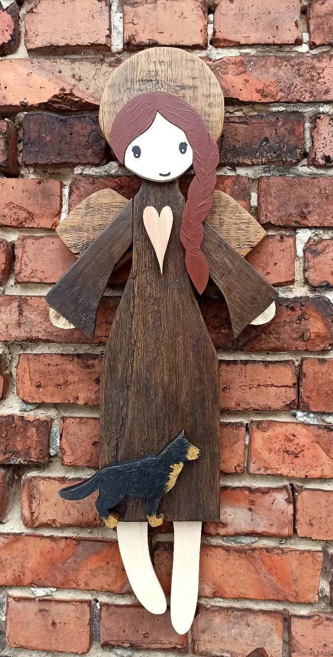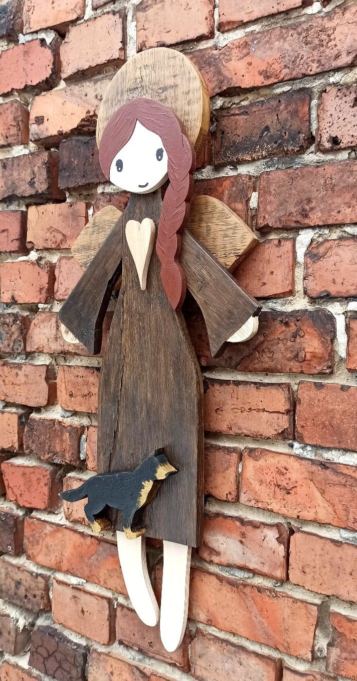 Anioł z warkoczem i psem. Wykonany ze starej deski plus dodatki ze sklejki. Wysokość to ok 70 cm. Na zamówienie dowolna kolorystyka i rasa psa lub inny Pupil domowy. Wystarczy napisać do mnie wiadomość a razem ustalimy szczegóły.