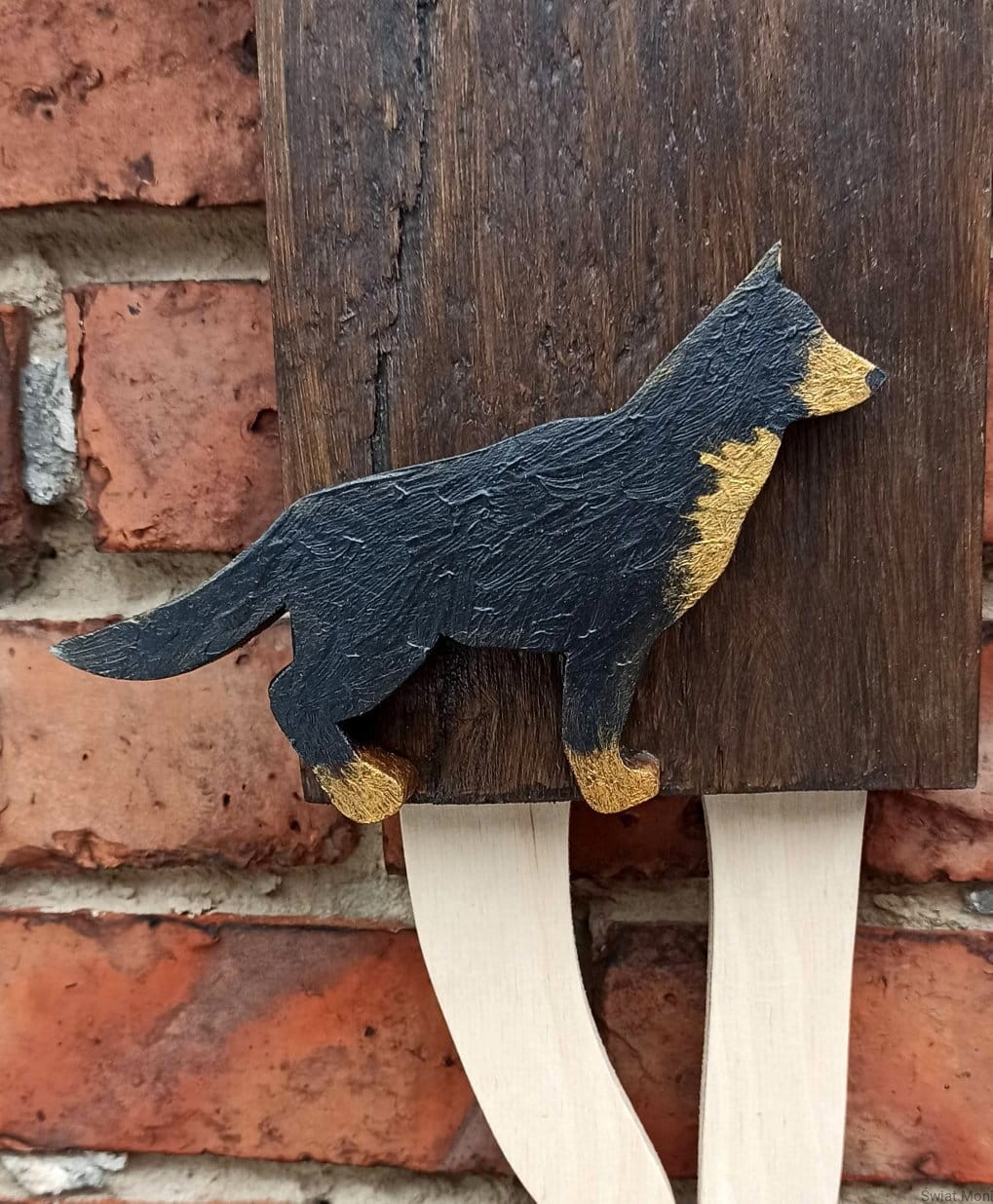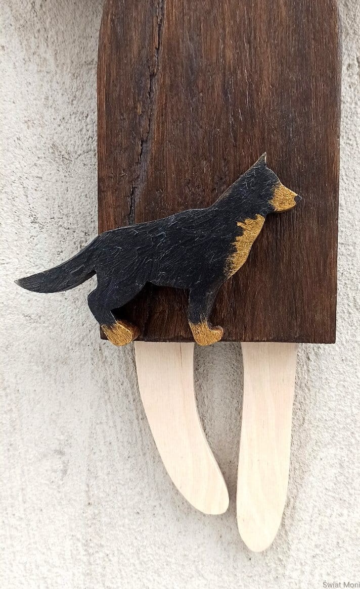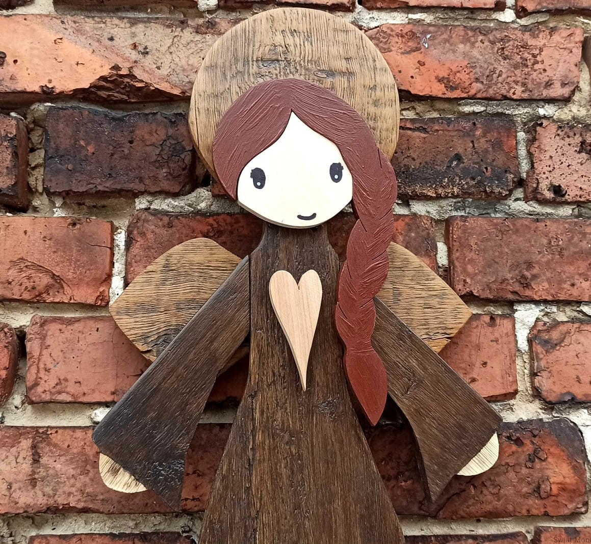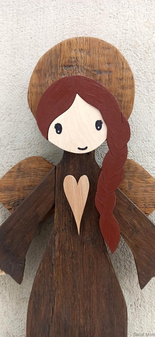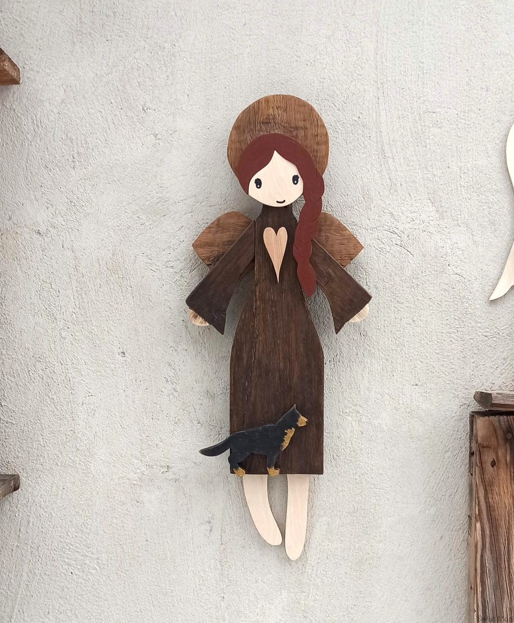 Anioł z warkoczem i psem. Wykonany ze starej deski plus dodatki ze sklejki. Wysokość to ok 70 cm. Na zamówienie dowolna kolorystyka i rasa psa lub inny Pupil domowy. Wystarczy napisać do mnie wiadomość a razem ustalimy szczegóły.